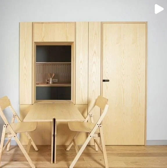 O/C vine de la open/close si a fost gandit ca un separator intre bucatarie si living pentru un apartament mic. poate fi deschis partial folosind usa si folosit ca placare atunci cand zona de zi are nevoie de mai mult spatiu. ori complet deschis atunci cand bucataria trebuie extinsa printr-o zona de luat masa.